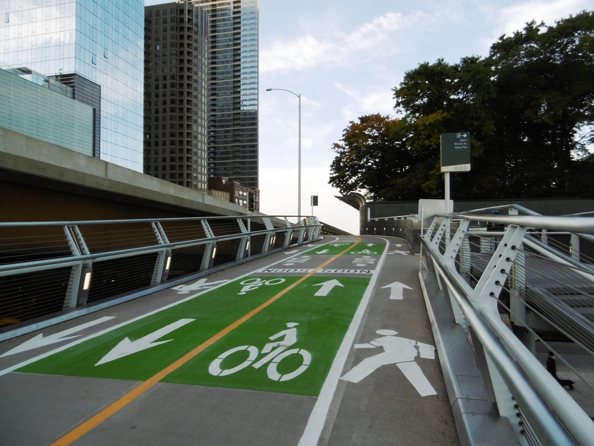 River Walk: hay que caminar todo este paseo a orillas del rio, de un lado y del otro, de noche y de día. Sin excusas. Es el corazón de Chicago. Por la noche me encontré con grandiosas proyecciones sobre la fachada del Merchandise Mark. Tiene baños públicos muy seguido y cómodos bancos para sentarse a descansar y mirar sin apuro esta bella ciudad. Hacia el Oeste, por este paseo uno puede llegar caminando a Navy Pier. Cuando hice este trayecto, me encontré con obras para peatones y ciclistas, que seguramente darán que hablar en un futuro. Anduve por debajo de N Lake Shore Dr. y la E Illinois Street me llevó a Navy Pier, donde espere la caída del sol. Chicago es mágica al atardecer.